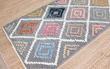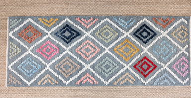 $764| /A runner-size wool rug that features a design composed of knotted yarns that form diamonds in white, pink, salmon, blue and brown on a sage backgro...