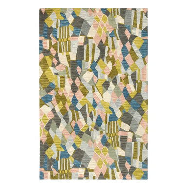 $764| /A runner-size wool rug that features a design composed of knotted yarns that form diamonds in white, pink, salmon, blue and brown on a sage backgro...